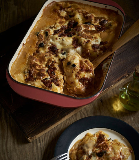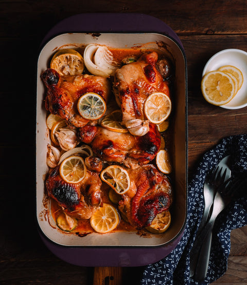 100%鑄鐵一體成型打造,可以整個放進烤箱中烘烤。最美味的料理來自最簡單的做法,只要將食材與配料放入、調味、進烤箱,一會就可以享用了,不管要烤肉還是做蛋糕都可以。